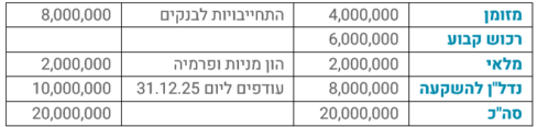 יתרת העודפים בעסק ליום 31.12.2024 הם 8,000,000 ש"ח ולהלן מאזן ליום 31.12.2025: